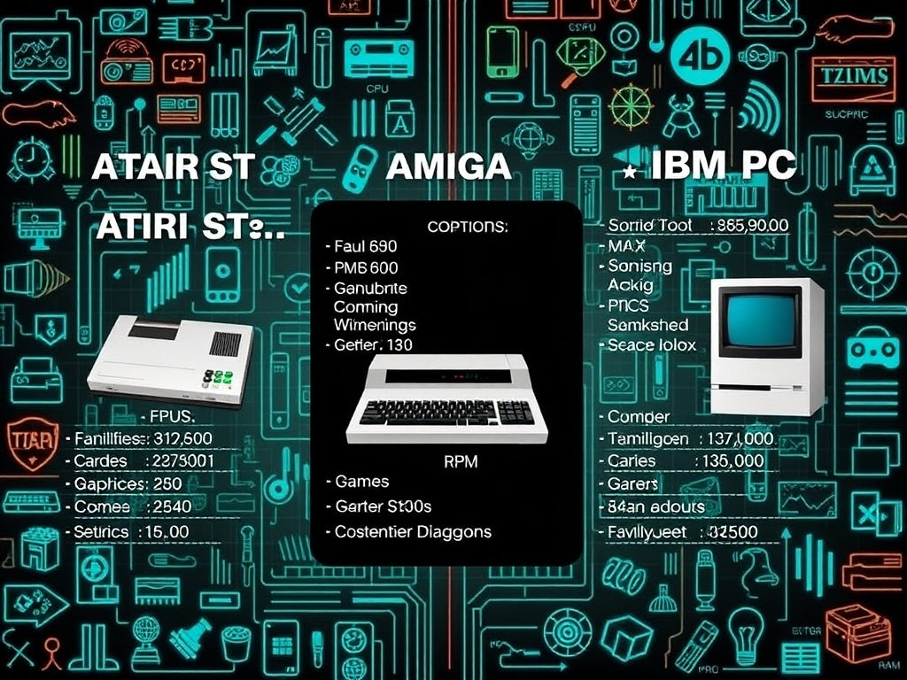 Technical specifications comparison of Atari ST, Commodore Amiga, and IBM PC.