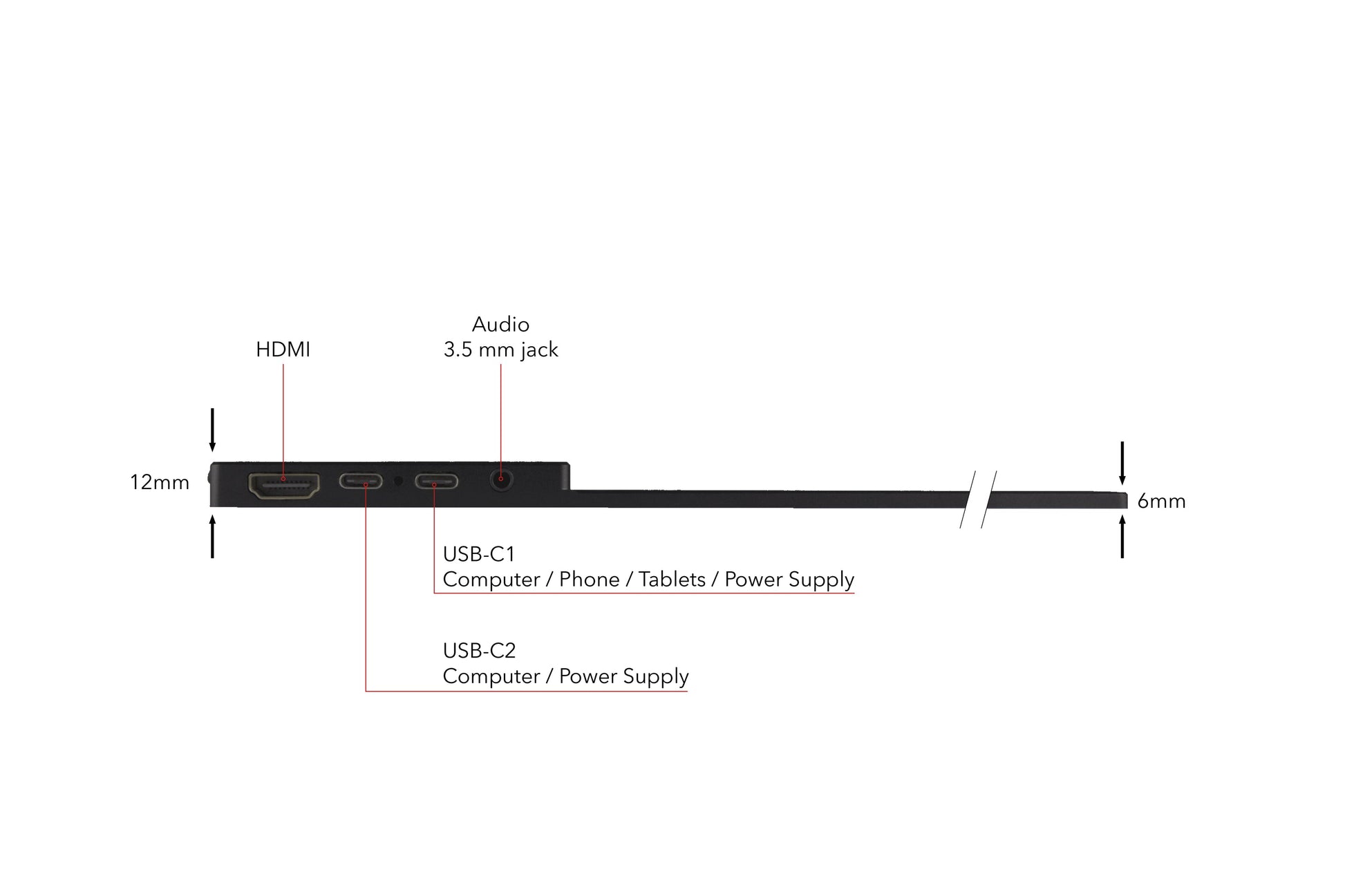 El monitor portátil se conecta mediante USB-C, lo que permite la transferencia de energía, datos y video con un solo cable. Simplemente conéctalo a tu laptop, Mac, tableta, teléfono o consola de juegos, ¡y comienza a compartir pantallas!* También se incluye un cable HDMI para quienes necesiten conexión HDMI. Usar HDMI requiere una fuente de alimentación, que también está incluida. Para la función táctil, se requiere un cable USB adicional. La fuente de alimentación también permite un uso prolongado de los dispositivos conectados mediante USB-C.